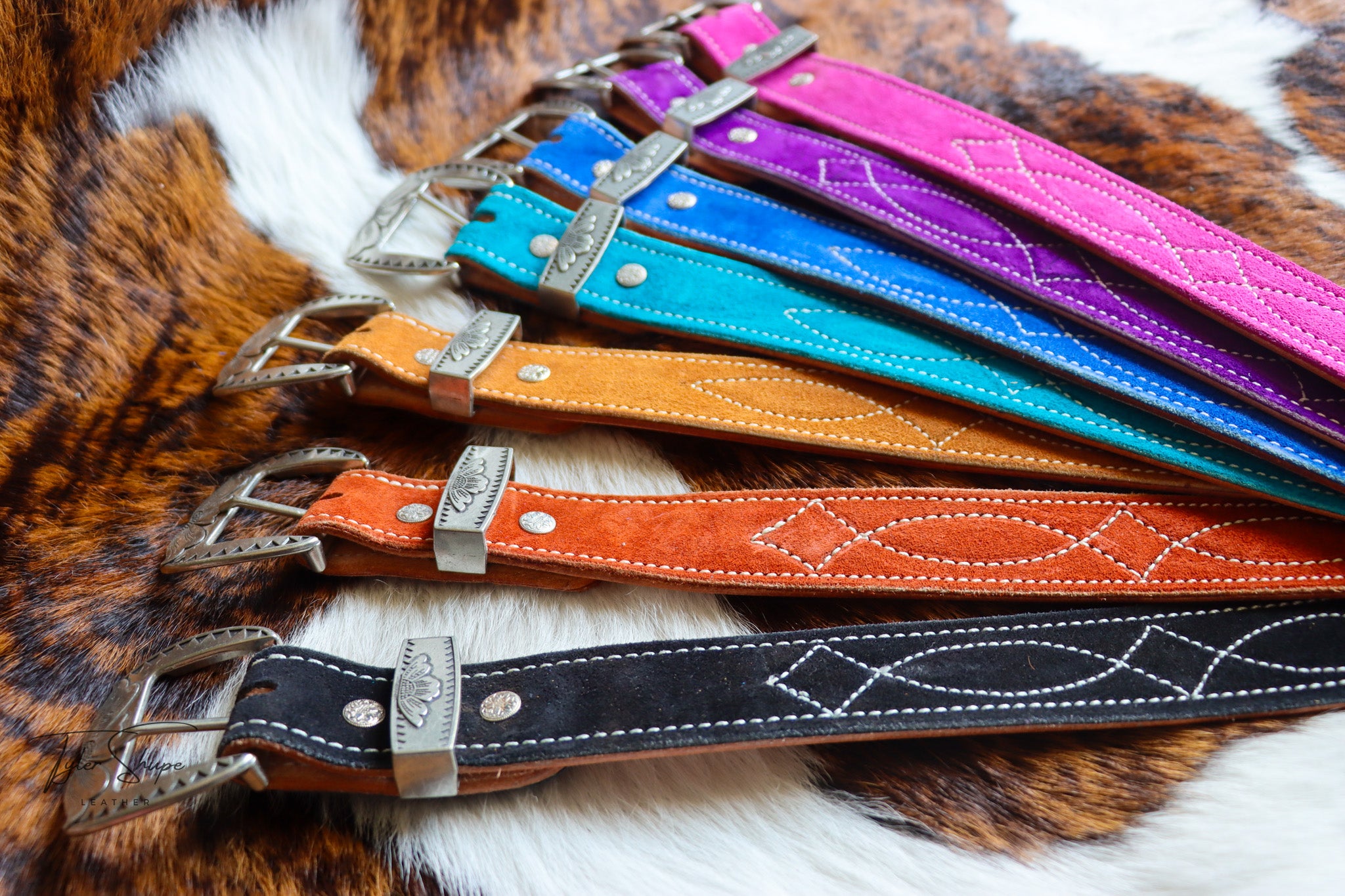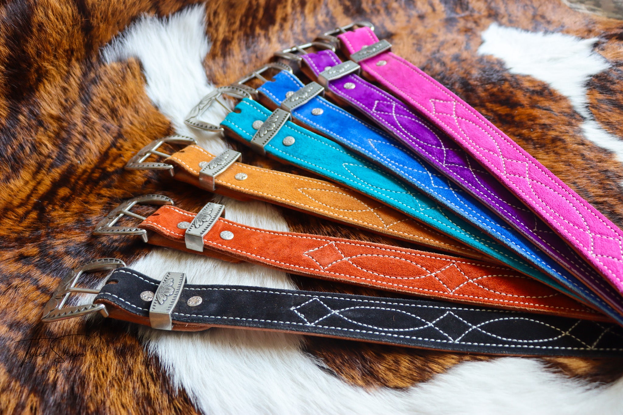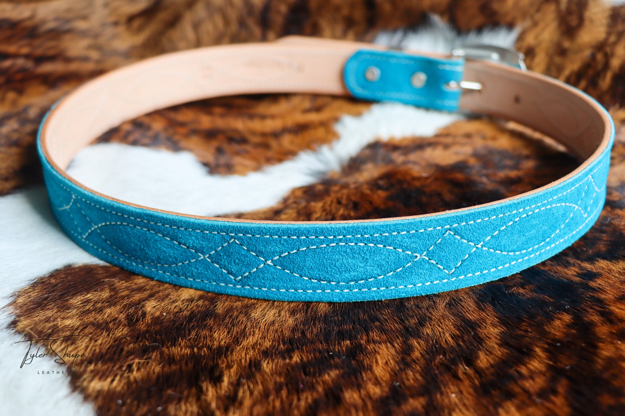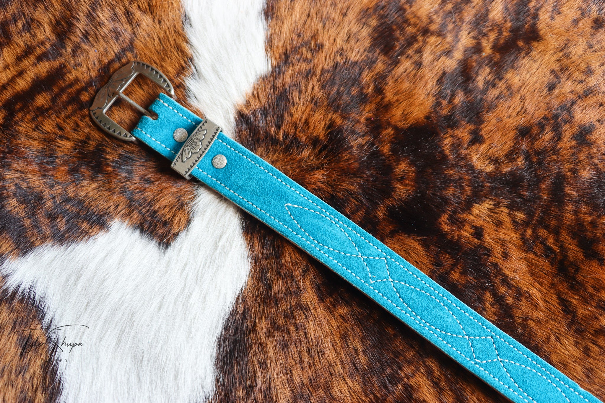 Introducing the Hideout Suede Collection: Add a bold pop of color to your wardrobe with our handcrafted Turquoise Suede Belt. Made from premium full-grain leather and finished with a rich suede overlay, this belt is built to make a statement while standing up to everyday wear. Each belt features western detailed white stitching and an antiqued Western-style engraved buckle that pairs perfectly with jeans or show attire. Whether you're dressing up or cinching down, this belt blends style with strength.