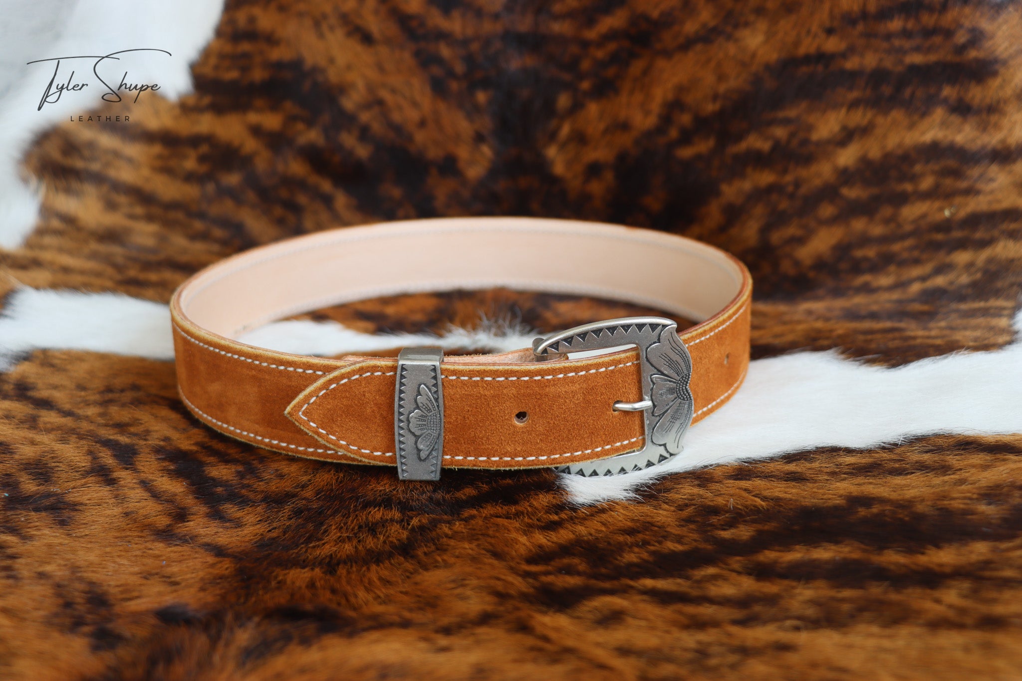 Introducing the Trailmark Suede Collection: Add a bold pop of color to your wardrobe with our handcrafted English Toast Suede Belt. Made from premium full-grain leather and finished with a rich suede overlay, this belt is built to make a statement while standing up to everyday wear. Each belt features sturdy white stitching and an antiqued Western-style engraved buckle that pairs perfectly with jeans or show attire. Whether you're dressing up or cinching down, this belt blends style with strength.
