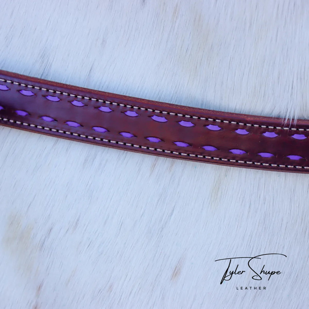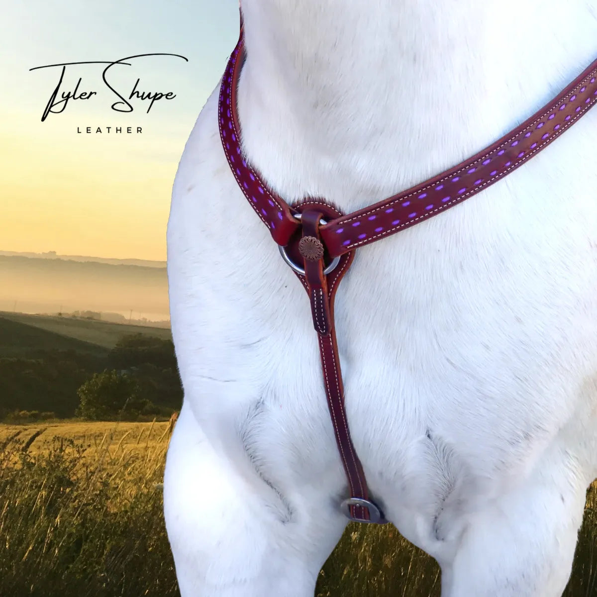 Our collection of 1.25" straight breast collars, where elegance meets equestrian style. Available in dark oil or with buck stitch details and your choice of decorative conchos. These collars are crafted to showcase the beauty of your horse in the arena. Elevate your riding experience with our premium and eye-catching designs, meticulously created with Tyler Shupe quality for both performance and aesthetics. Purple.