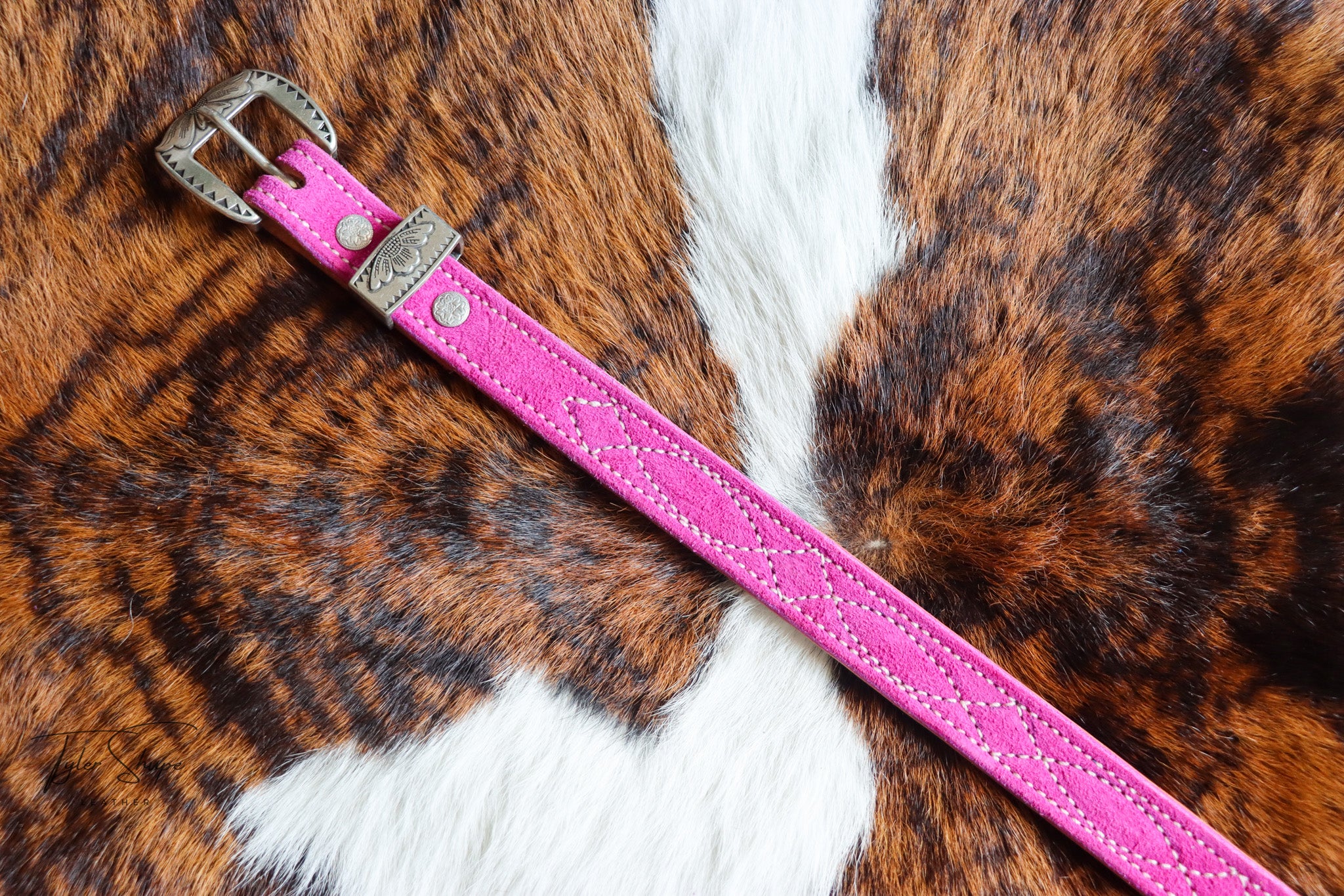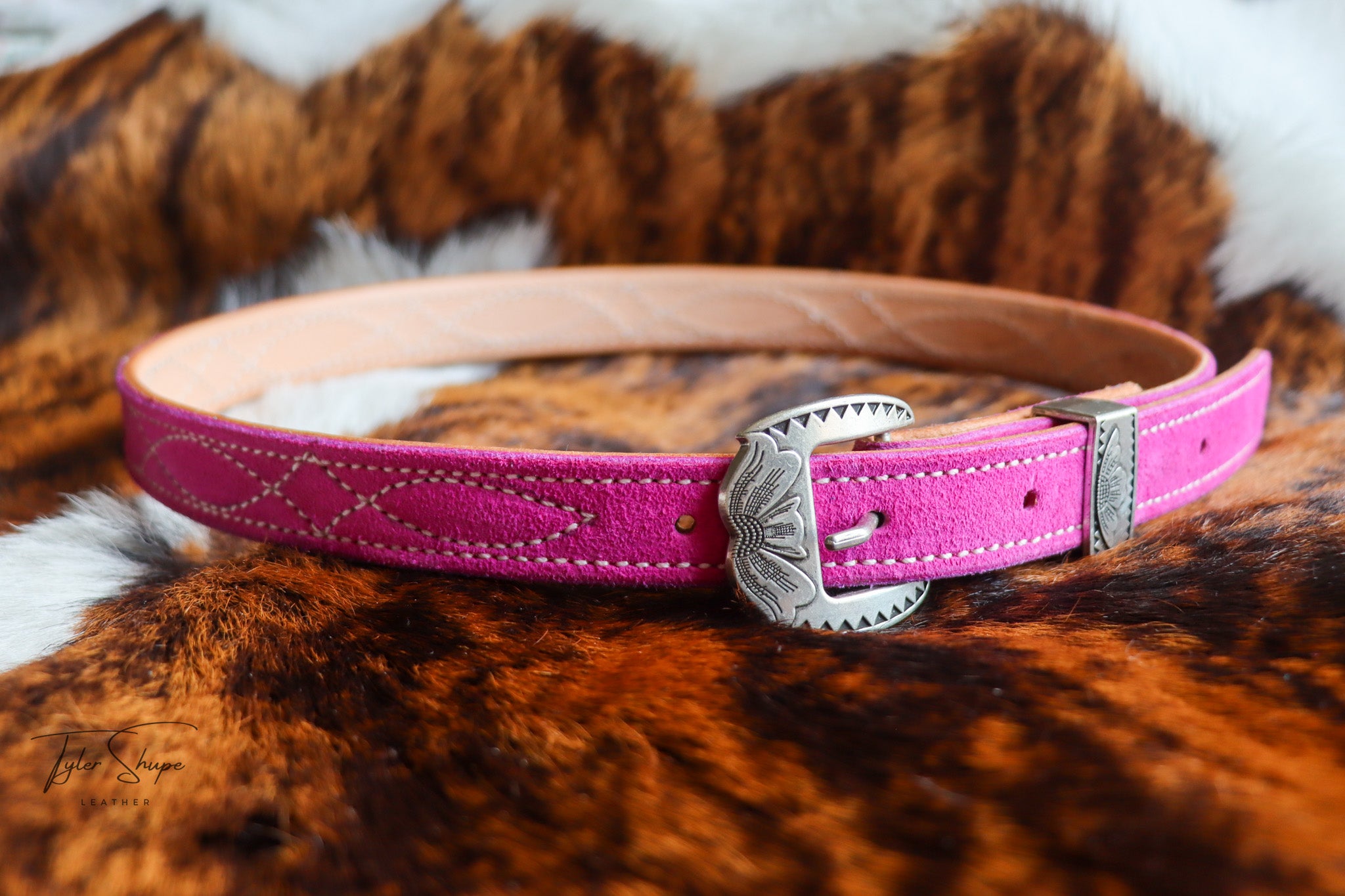 Let your little one dress like a champ with our handcrafted Hideout Collection Fuchsia Suede Belt. Built with the same quality and detail as our full-size belts, this mini version features genuine full-grain leather layered with soft suede in bold, kid-approved color. Finished with a 1" width, durable white stitching, and a silver-tone Western buckle, it's perfect for rodeos, school, or everyday wear.