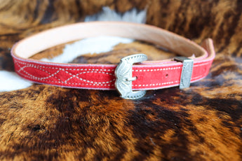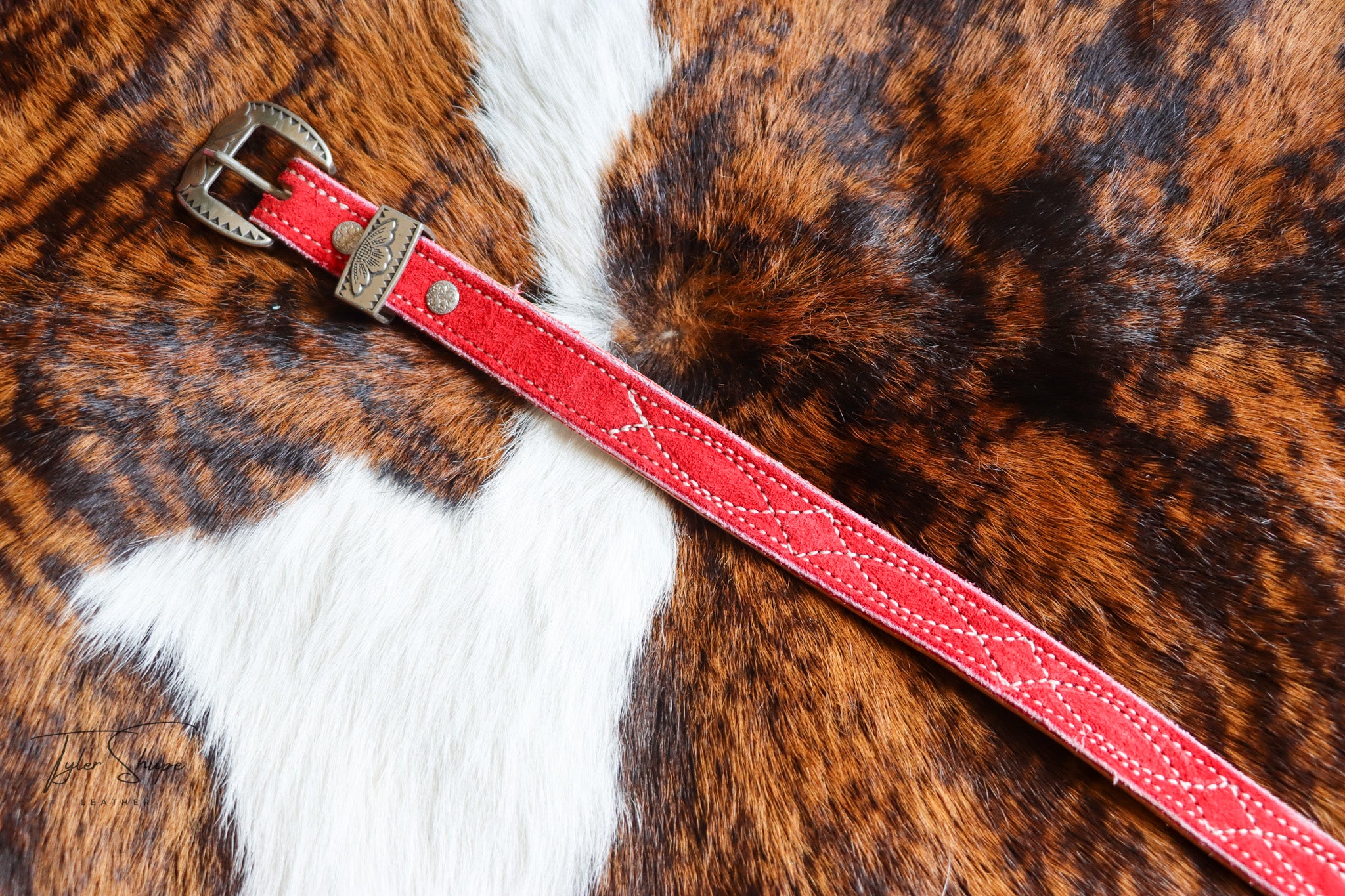 Let your little one dress like a champ with our handcrafted Hideout Collection Red Suede Belt. Built with the same quality and detail as our full-size belts, this mini version features genuine full-grain leather layered with soft suede in bold, kid-approved color. Finished with a 1" width, durable white stitching, and a silver-tone Western buckle, it's perfect for rodeos, school, or everyday wear.