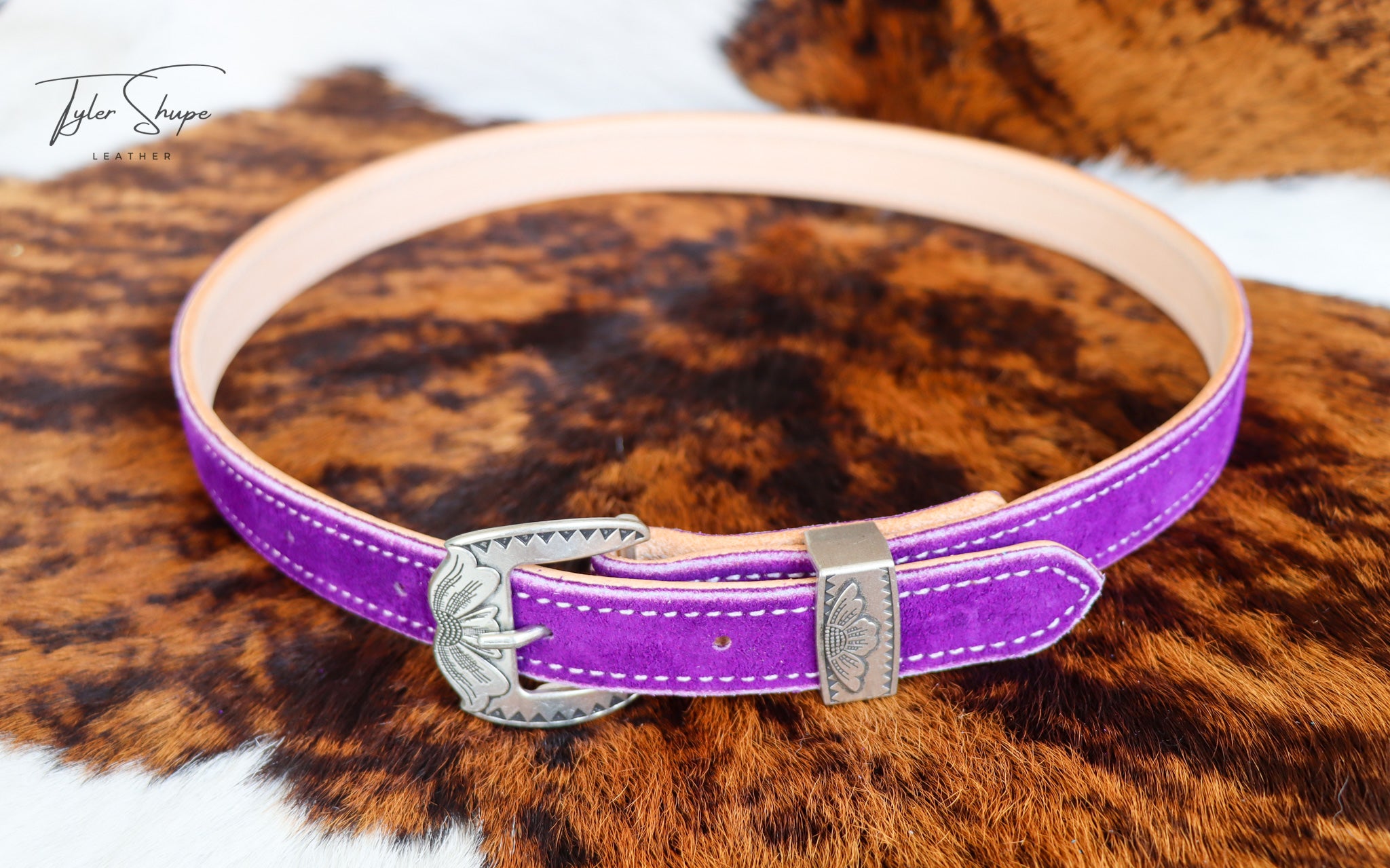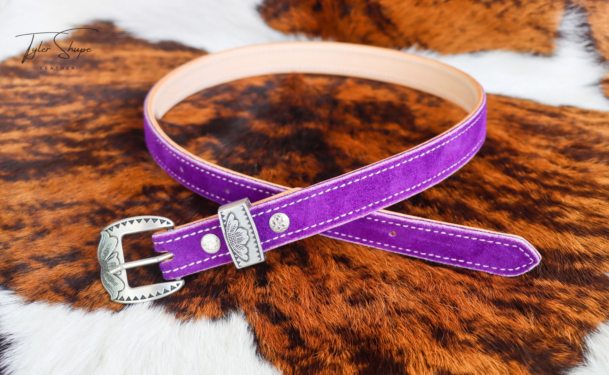 Let your little one dress like a champ with our handcrafted Purple Trailmark Collection Suede Belt. Built with the same quality and detail as our full-size belts, this mini version features genuine full-grain leather layered with soft suede in bold, kid-approved color. Finished with a 1" width, durable white stitching, and a silver-tone Western buckle, it's perfect for rodeos, school, or everyday wear.
