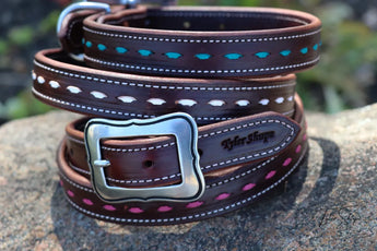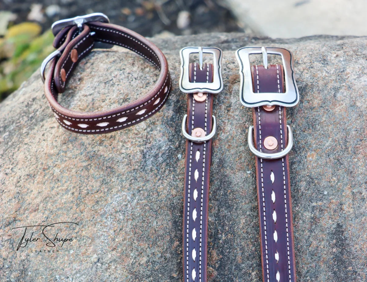 Introducing our Heritage Dog Collar. Meticulously handcrafted with a fusion of rustic charm and modern elegance, each collar tells a story of heritage and style. Indulge in the artistry of western tradition, where detailed buckstitching meets premium leather, creating a statement piece that seamlessly blends authenticity and fashion. Please use our belt guide as a reference for measuring. White