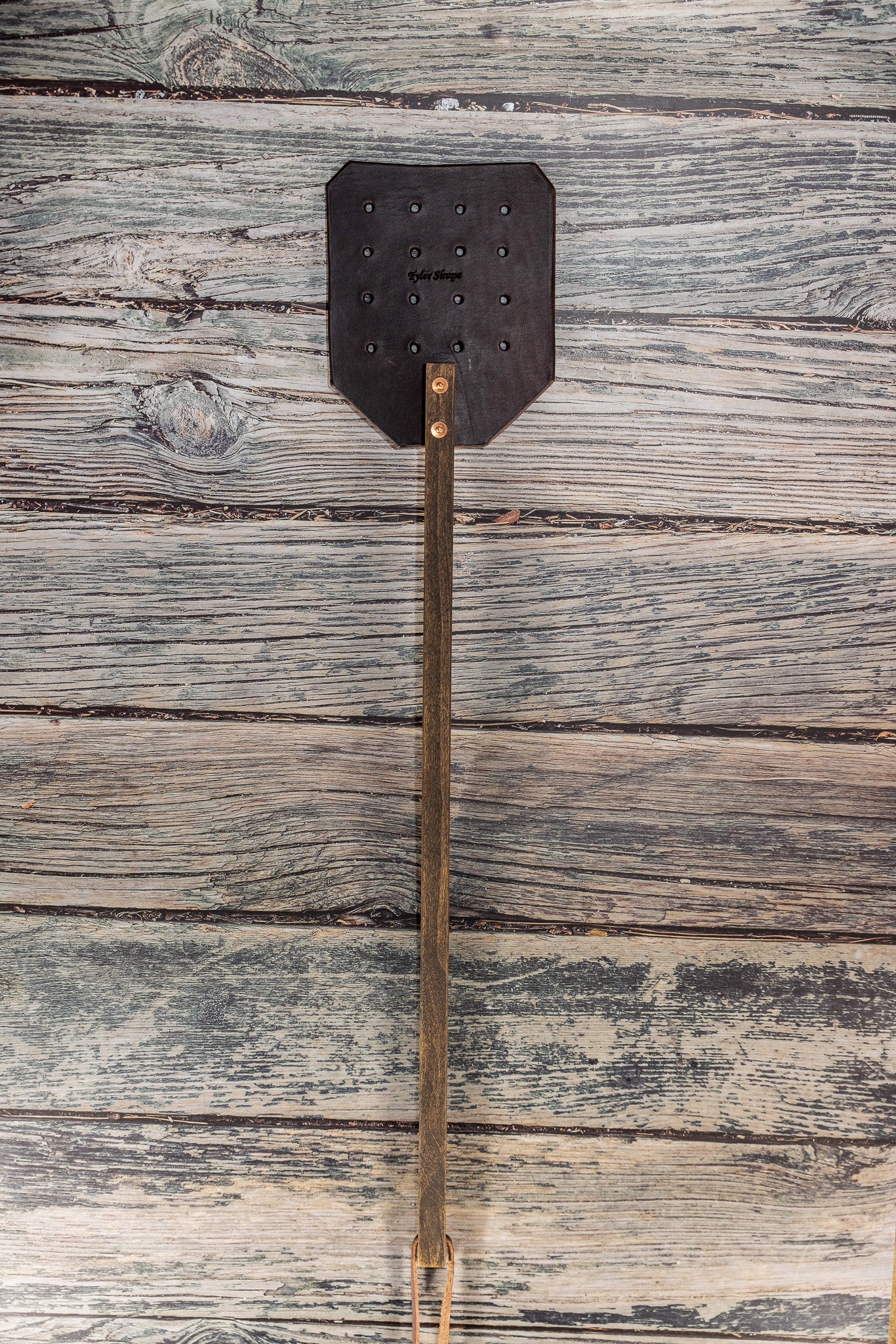 Handcrafted Leather Fly Swatter Built to last and made with style, our handcrafted leather fly swatter brings a touch of rugged elegance to a practical everyday tool. Each one is made with premium leather and a solid wood handle, secured with hand-set copper rivets for unmatched durability. Whether you’re on the porch, in the barn, or in the house, this swatter is ready to handle pests the old-fashioned way—with a satisfying snap. Finished with our signature touch and designed to be both functional and beautiful, it’s a piece you’ll be proud to leave out.
