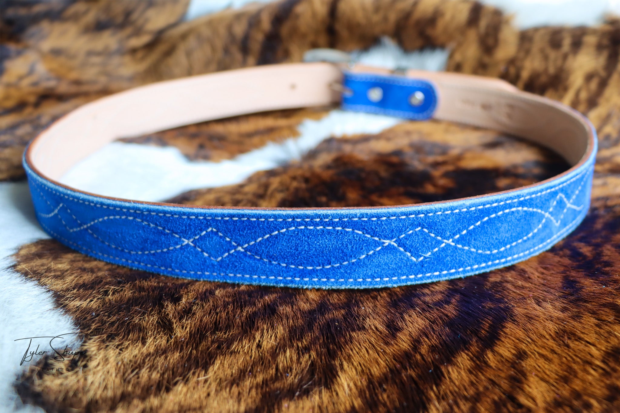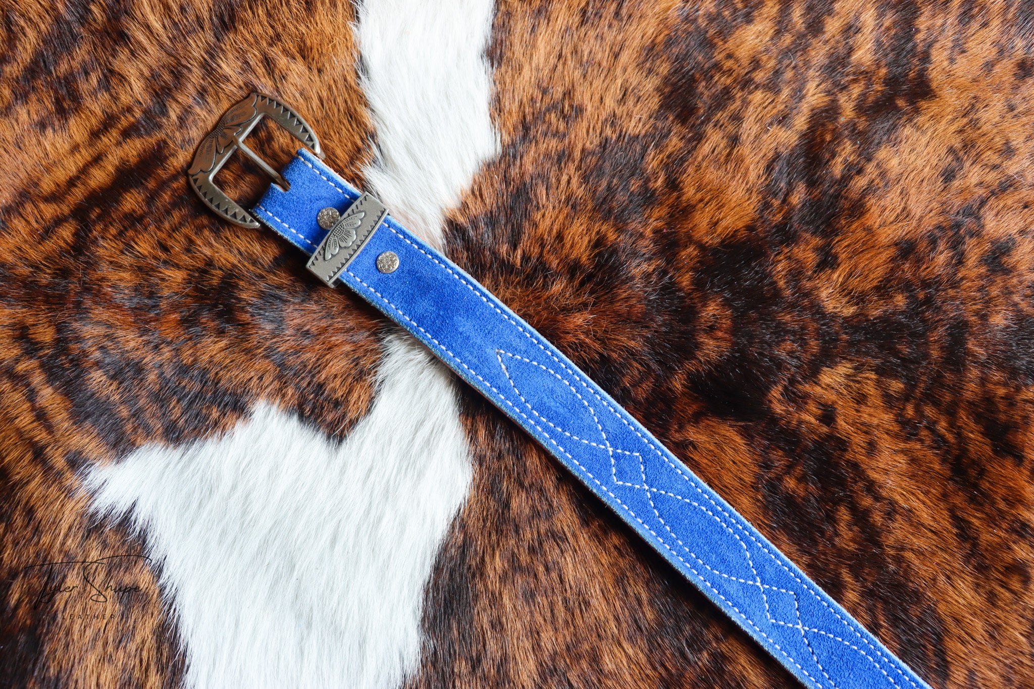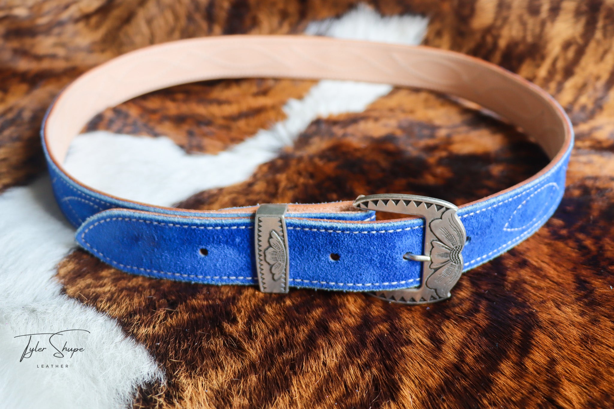 Introducing the Hideout Suede Collection: Add a bold pop of color to your wardrobe with our handcrafted Royal Suede Belt. Made from premium full-grain leather and finished with a rich suede overlay, this belt is built to make a statement while standing up to everyday wear. Each belt features western detailed white stitching and an antiqued Western-style engraved buckle that pairs perfectly with jeans or show attire. Whether you're dressing up or cinching down, this belt blends style with strength.