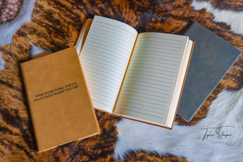 Keep your thoughts, sketches, or daily to-do lists in style with our premium leather notebooks. Each notebook features a smooth, soft-touch faux leather cover and is approximately 5.5" x 8.25" in size—perfect for slipping into your bag or keeping on your desk. Choose from three classic leather tones and order your notebook plain , with our signature "Own something they’ll fight over when you die." Solgan
