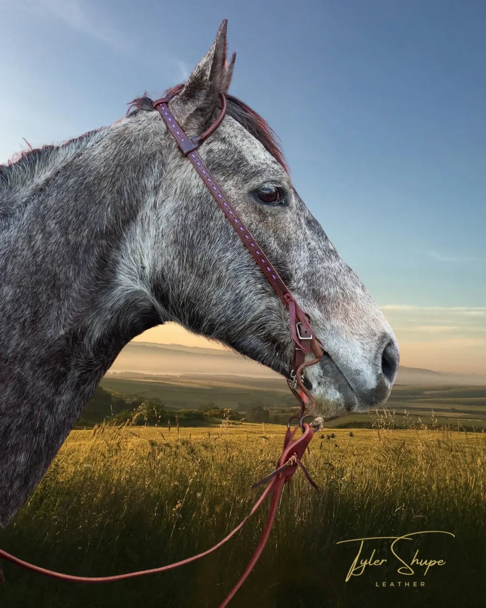 3/4" Purple Sliding Ear Headstall with decorative or solid stainless buckle. A refined addition to any tack collection. Crafted with premium english bridle leather, doubled and stitched, this lifelong accessory ensures impeccable style and our trademark soft, supple, buttery feel.