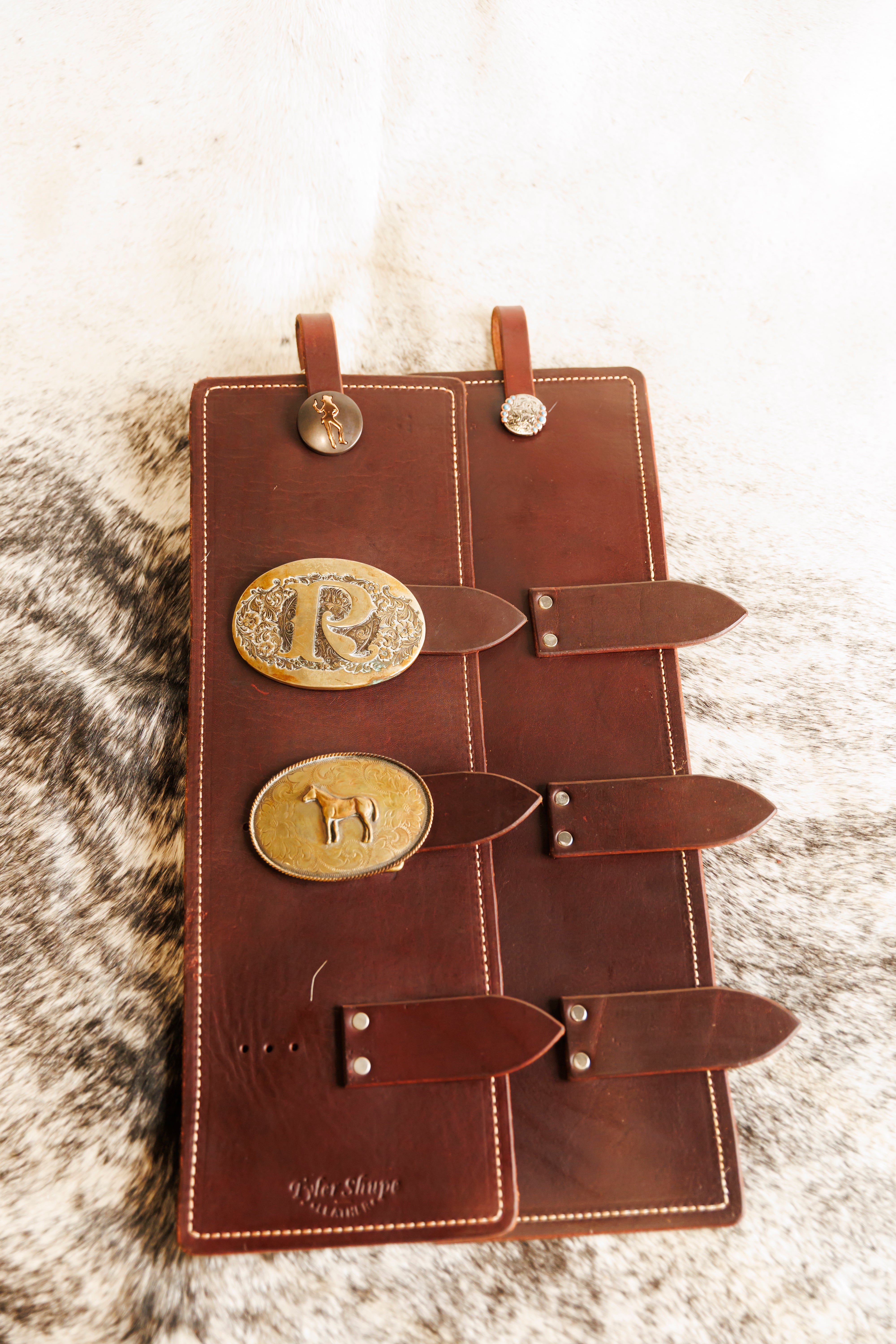 Celebrate your accomplishments with our 3-Buckle Leather Hanger. Crafted from rich, full-grain leather, this display is designed to keep your buckles organized and looking their best. Three riveted straps allow for secure attachment of your buckles, while the eye-catching concho and brass D-ring add a touch of western flair. Holds : 3 standard-sized award buckles