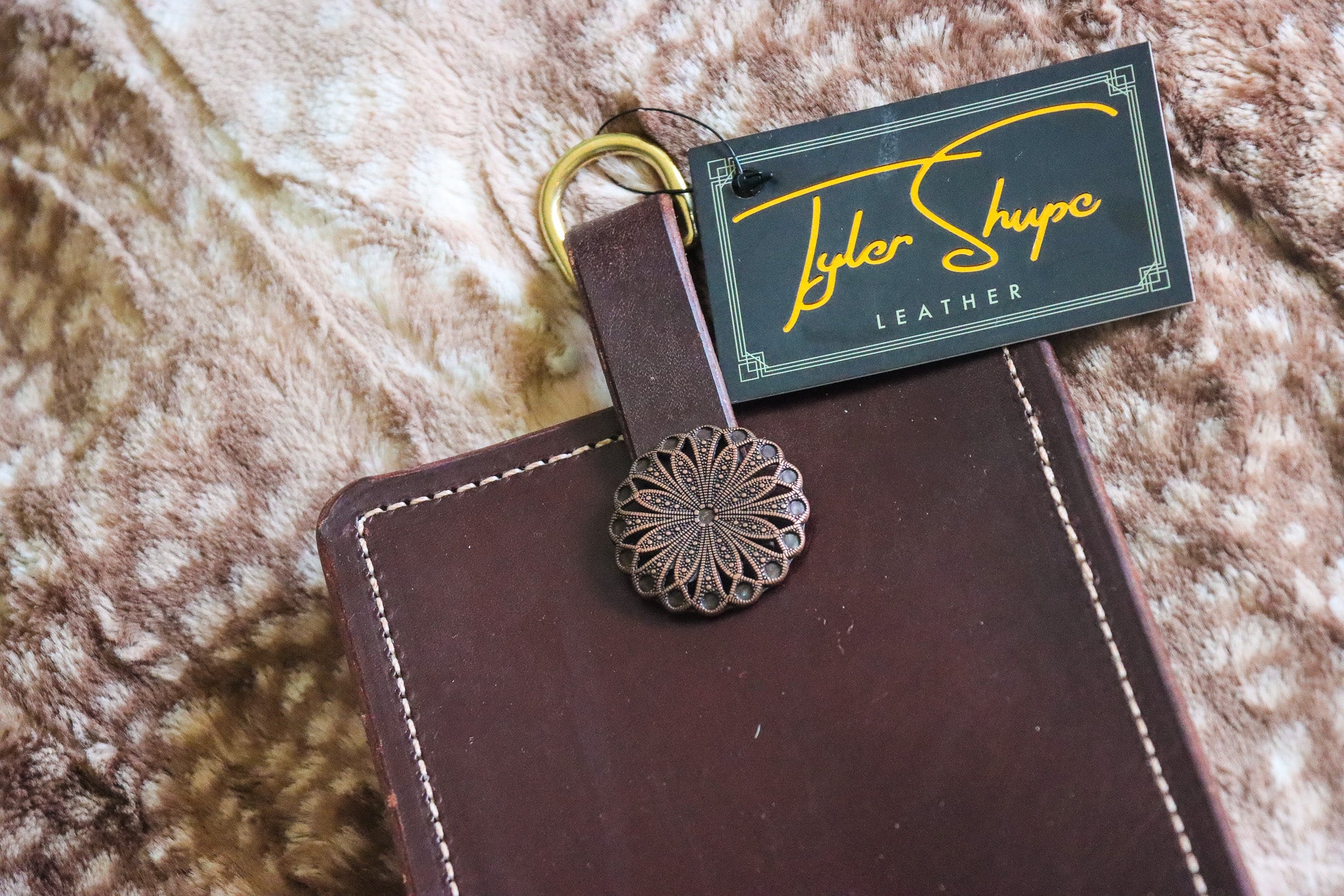 Features : Decorative western concho (customizable by request) Strong hanging D-ring for easy wall mounting Tyler Shupe Leather signature stamp Full-grain leather with hand-stitched edges Personalize it — ask us about customizing the concho to match your style.