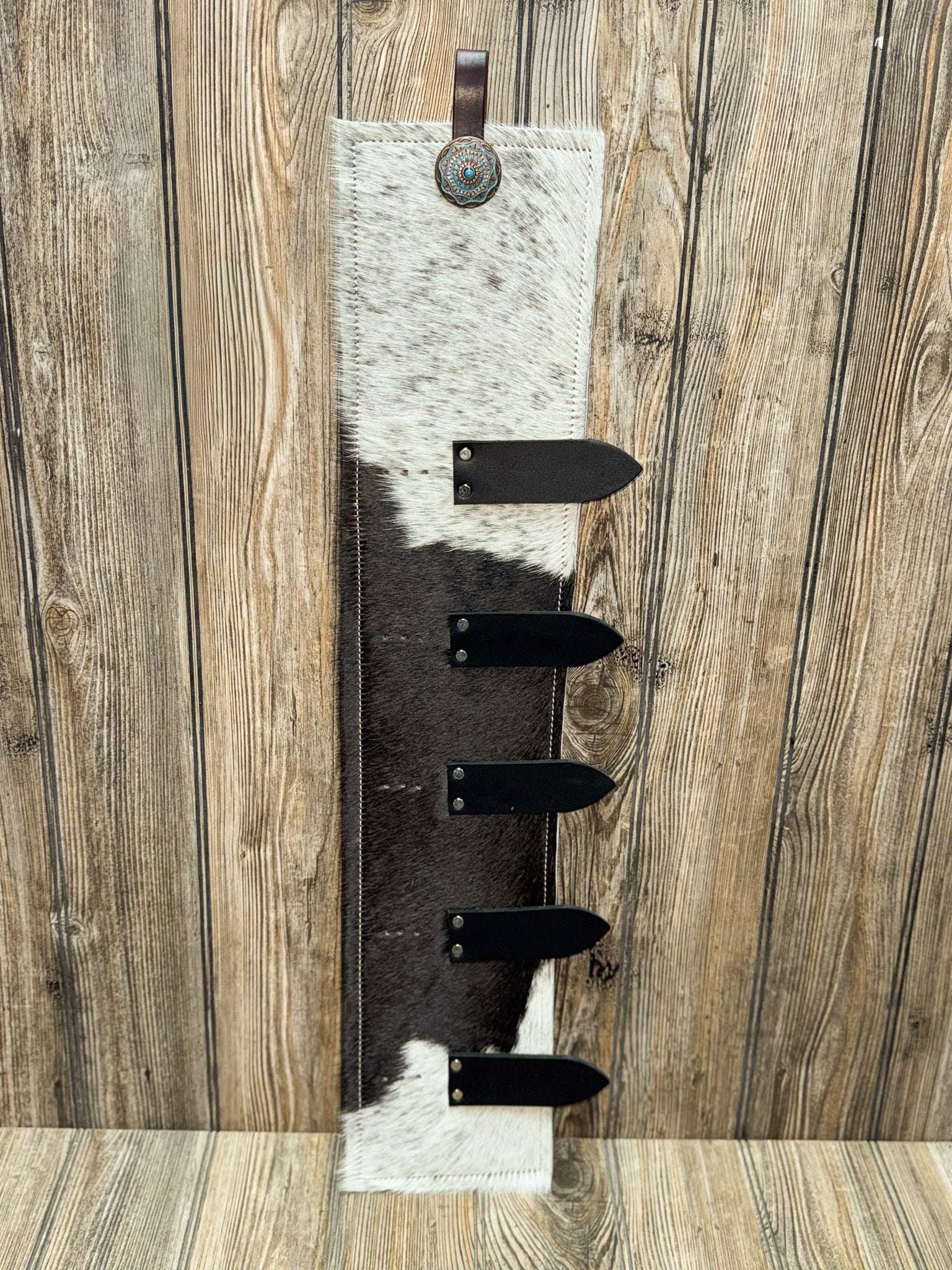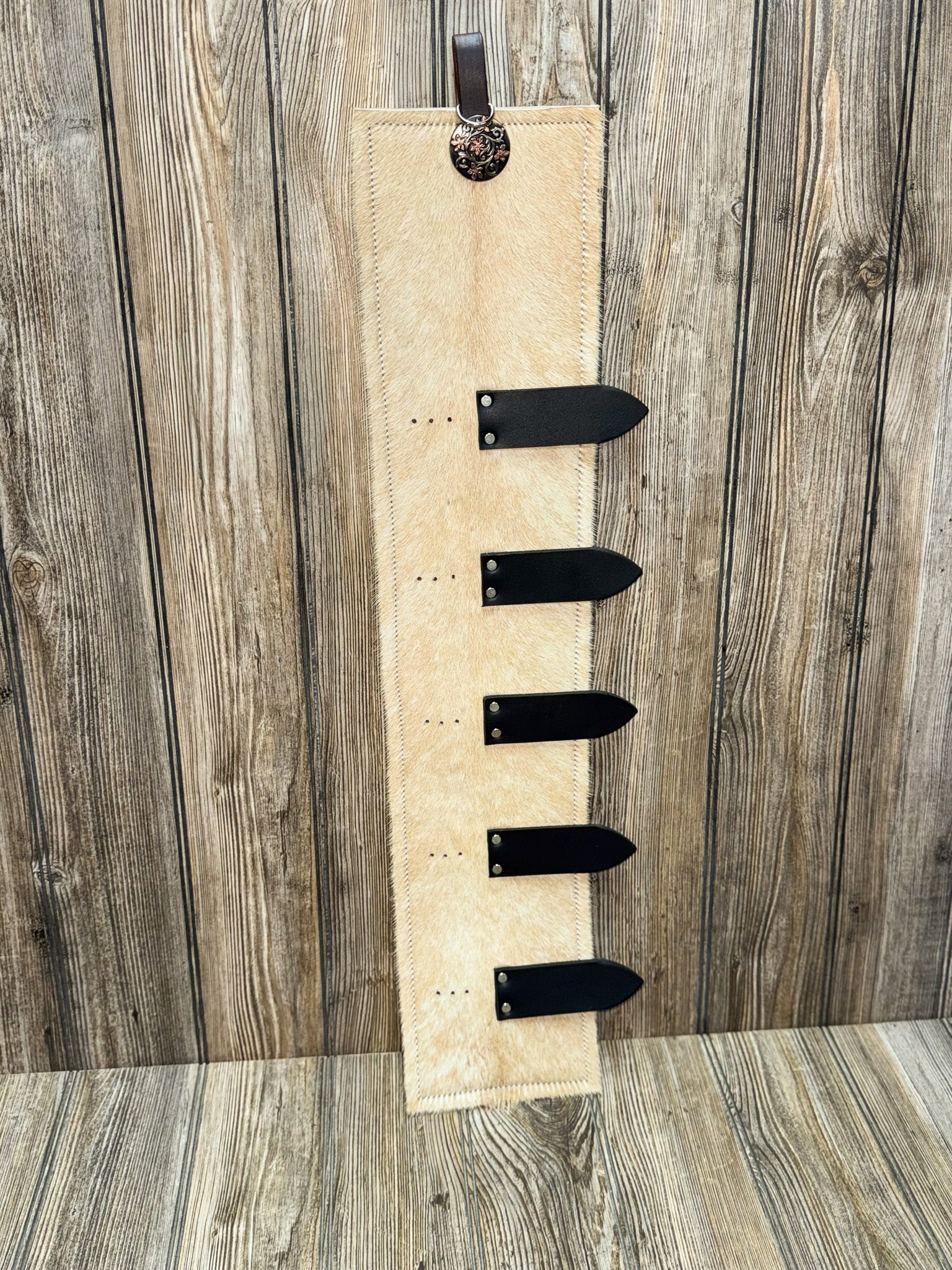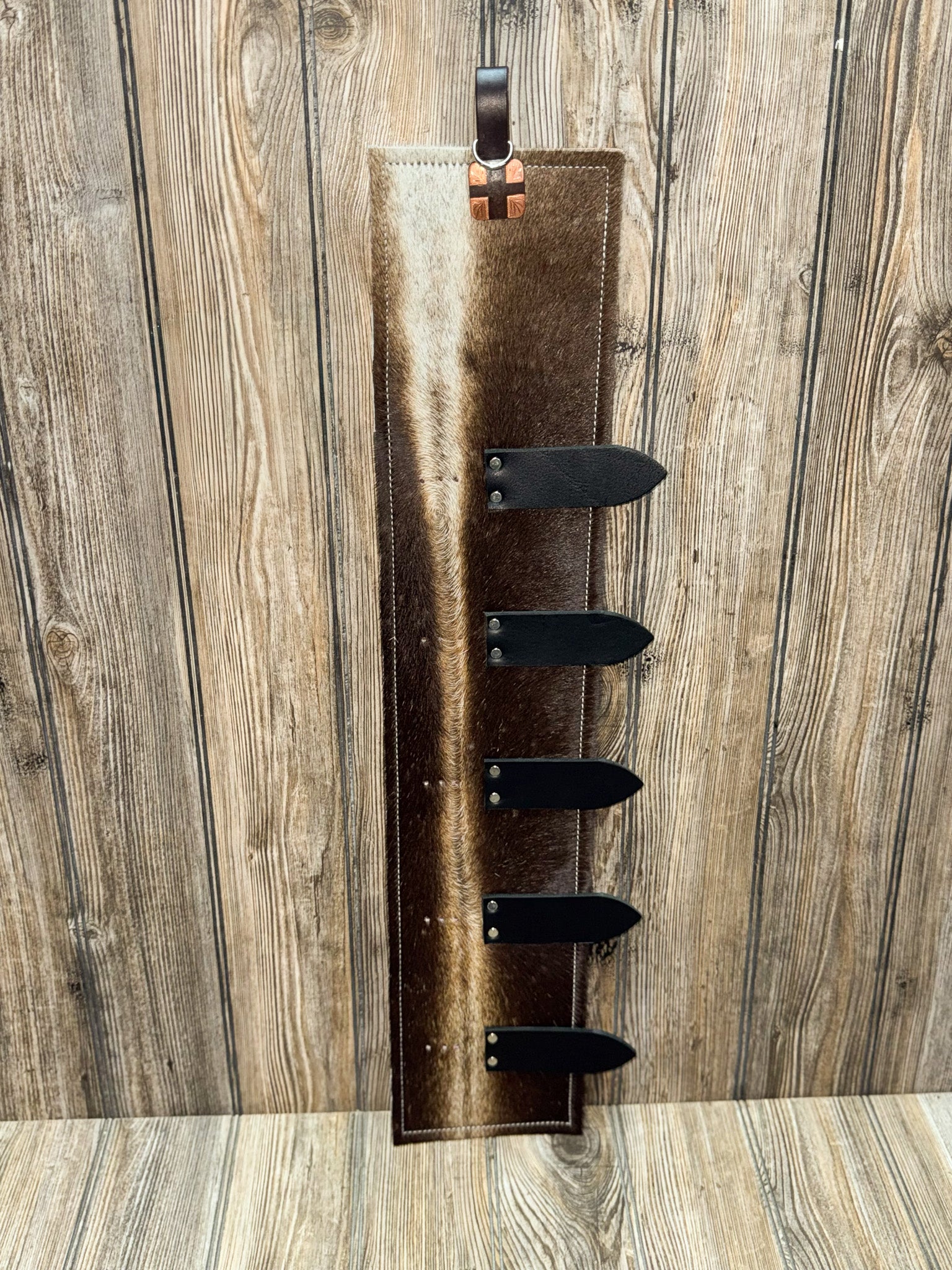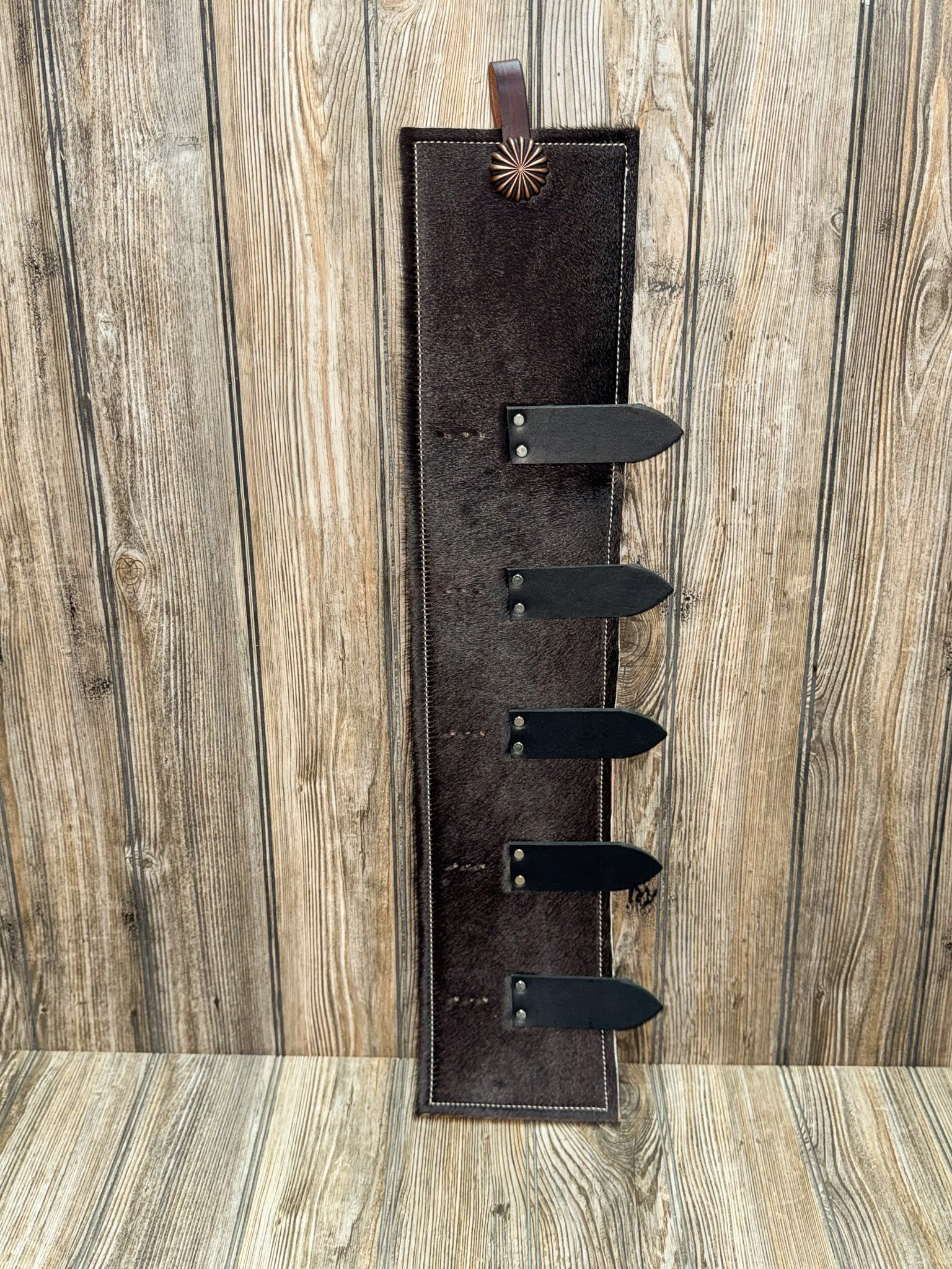 Make a statement with our Hair on Hide 5-Buckle Leather Hanger — the ultimate way to display your buckle collection. Meticulously handcrafted, this hanger features five leather straps for buckle display, each double-riveted for added strength. With a tooled concho accent and durable D-ring, it’s as stylish as it is practical.