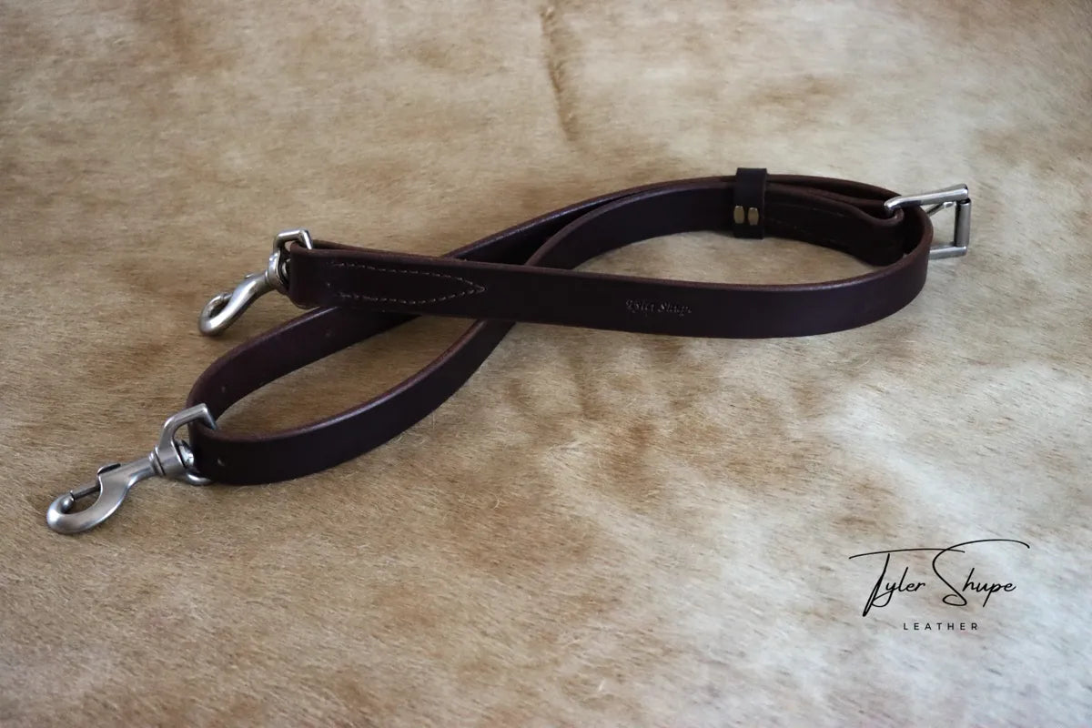 Leather with stainless hardware, 1” adjustable conway buckle Classic and strong- crafted from premium english bridle leather, dark oil.