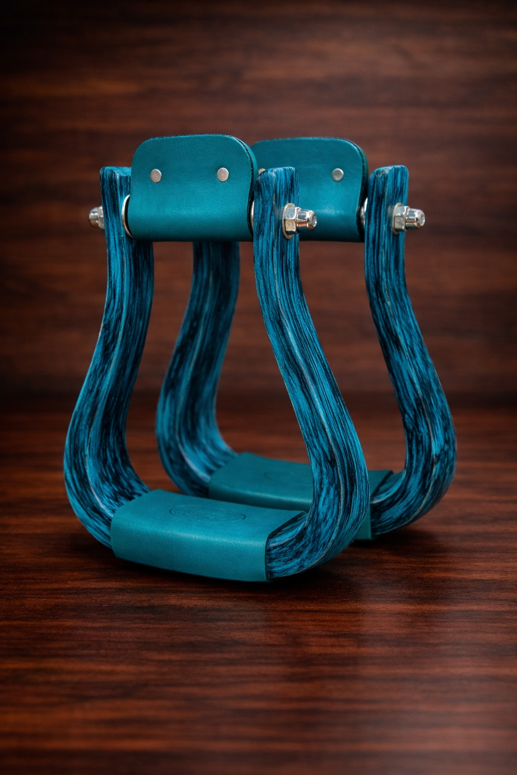 Add a bold Western look to your saddle with our Distressed Turquoise Rosewood Stirrups, a lightweight wooden stirrup designed for riders who want both performance and personality. These 2" stirrups are a popular choice among barrel racers, youth riders, and trail riders who want a comfortable stirrup that stands out in the arena or on the trail.