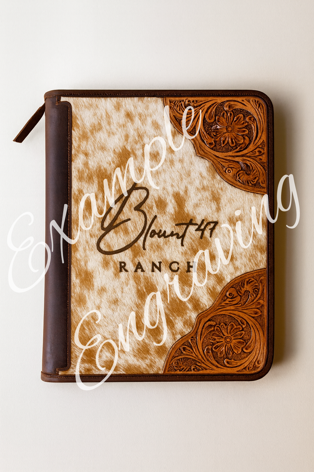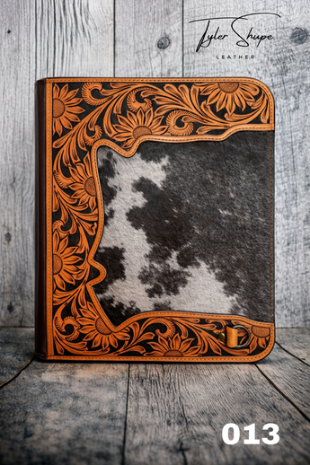 Built to turn heads in the boardroom or the branding pen, our Hair-On Hide 3-Ring Portfolio blends rugged durability with refined Western style. Each piece is handcrafted using rich, oil-tanned leather and premium hair-on cowhide, accented with hand-tooled floral corners for a touch of artistry and tradition. Inside, you’ll find a full-size three-ring binder, multiple interior document sleeves, and two card slots—perfect for organizing contracts, show records, or business essentials. A durable zipper closure keeps everything secure. Shoulder strap also included.
