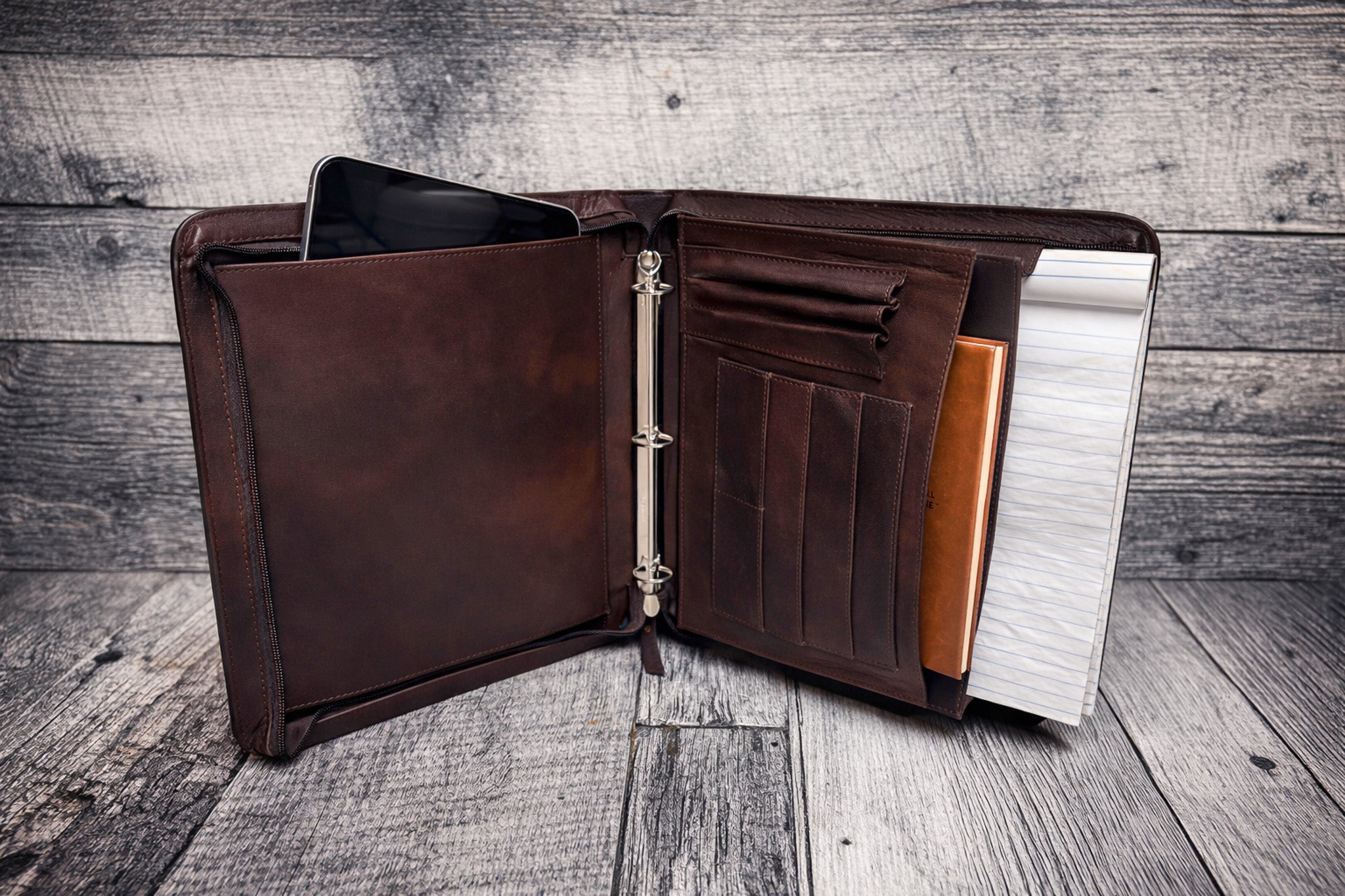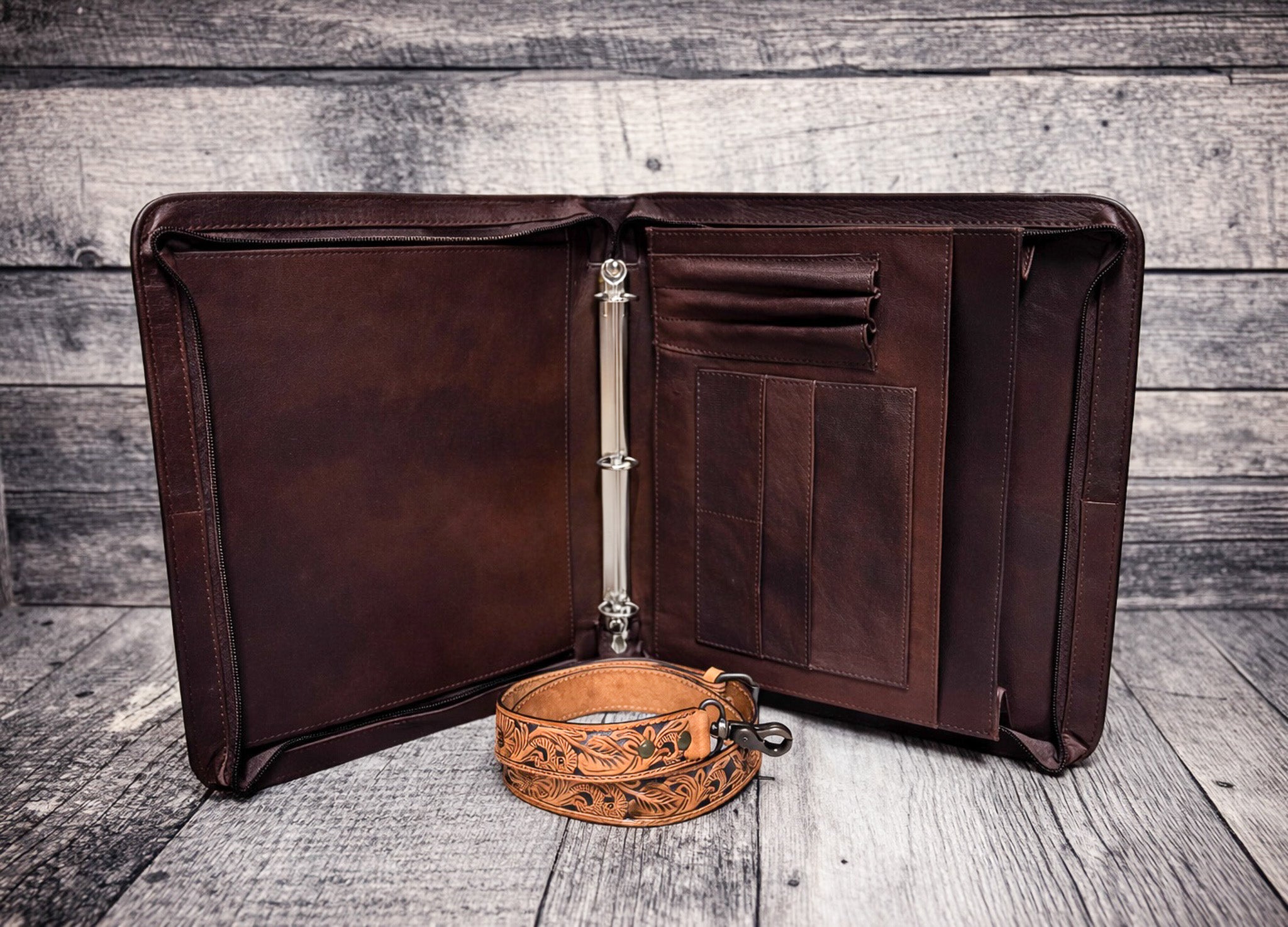 Approximate Dimensions: Overall size: 11.75” H x 10” W Fits standard 8.5" x 11" paper 1" three-ring metal binder Includes left-side document pocket and dual card holders This one-of-a-kind portfolio is the perfect companion for the office, arena, or show circuit—and just like everything from Tyler Shupe Leather, it’s made to be fought over when you’re gone.