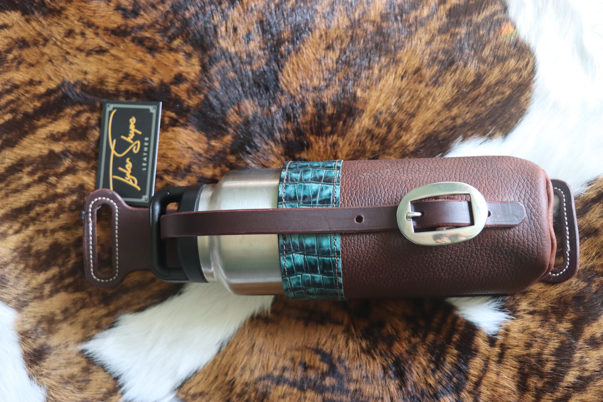 Leather Water Bottle Holder Stay hydrated in style with our handcrafted Leather Water Bottle Holder — built for riders, ranchers, and anyone who spends long days outdoors. Each holder is made from premium, full-grain leather with hand-finished details, sturdy stitching, and a classic western buckle closure. Easily attaches to your saddle, belt, or gear bag for hands-free convenience wherever you go. Designed to fit most standard water bottles, insulated tumblers, and thermoses. Choose from a variety of tooling styles, textures, and finishes to match your personal look.